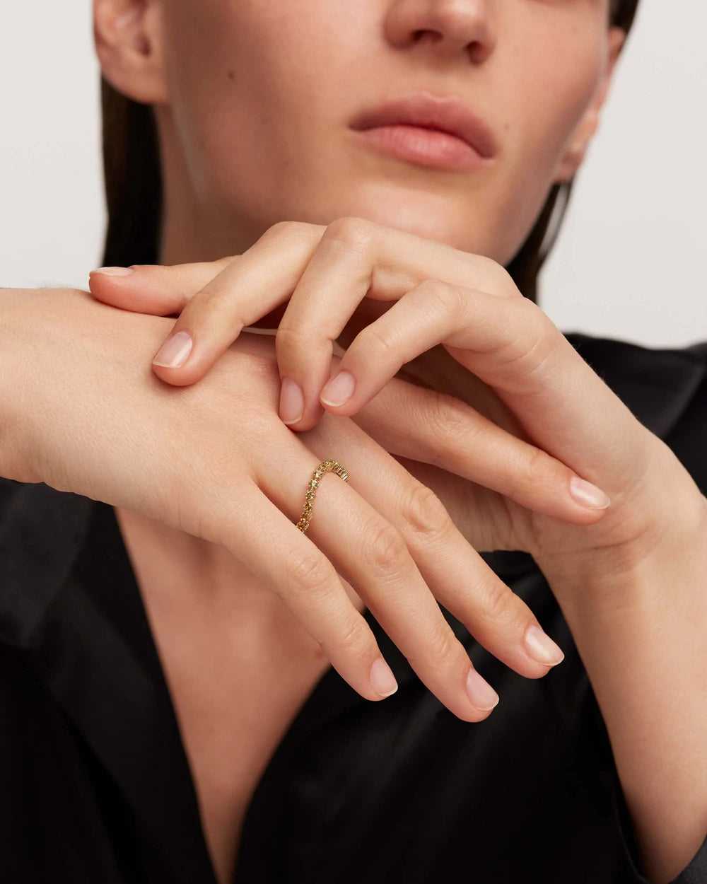 Une collection qui célèbre la nature essentielle de la vie : le changement constant. Les modèles suivent un motif de vague évoquant la danse magique de l’eau dans un océan qui n'est jamais immobile. Fabriquées en argent massif plaqué en or 18 ct, les pièces sont décorées de pierres serties avec un sertissage unique à huit griffes.