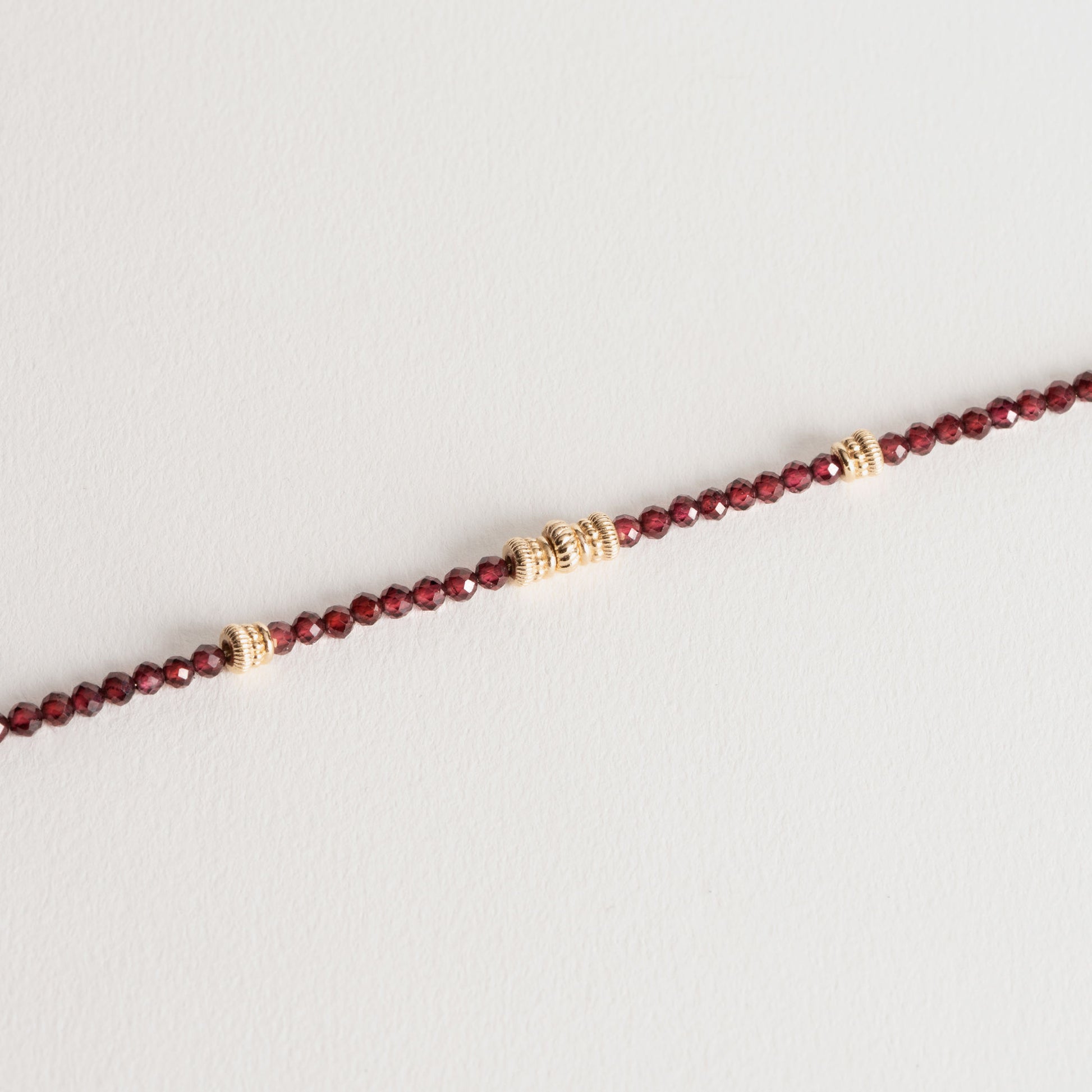 Le bracelet Lyra est parfait pour apporter une touche de couleur à votre look. Des pierres de grenat facettées au rouge étincelant ponctuées de motifs plaqués or texturés. Votre must have de cet été !
