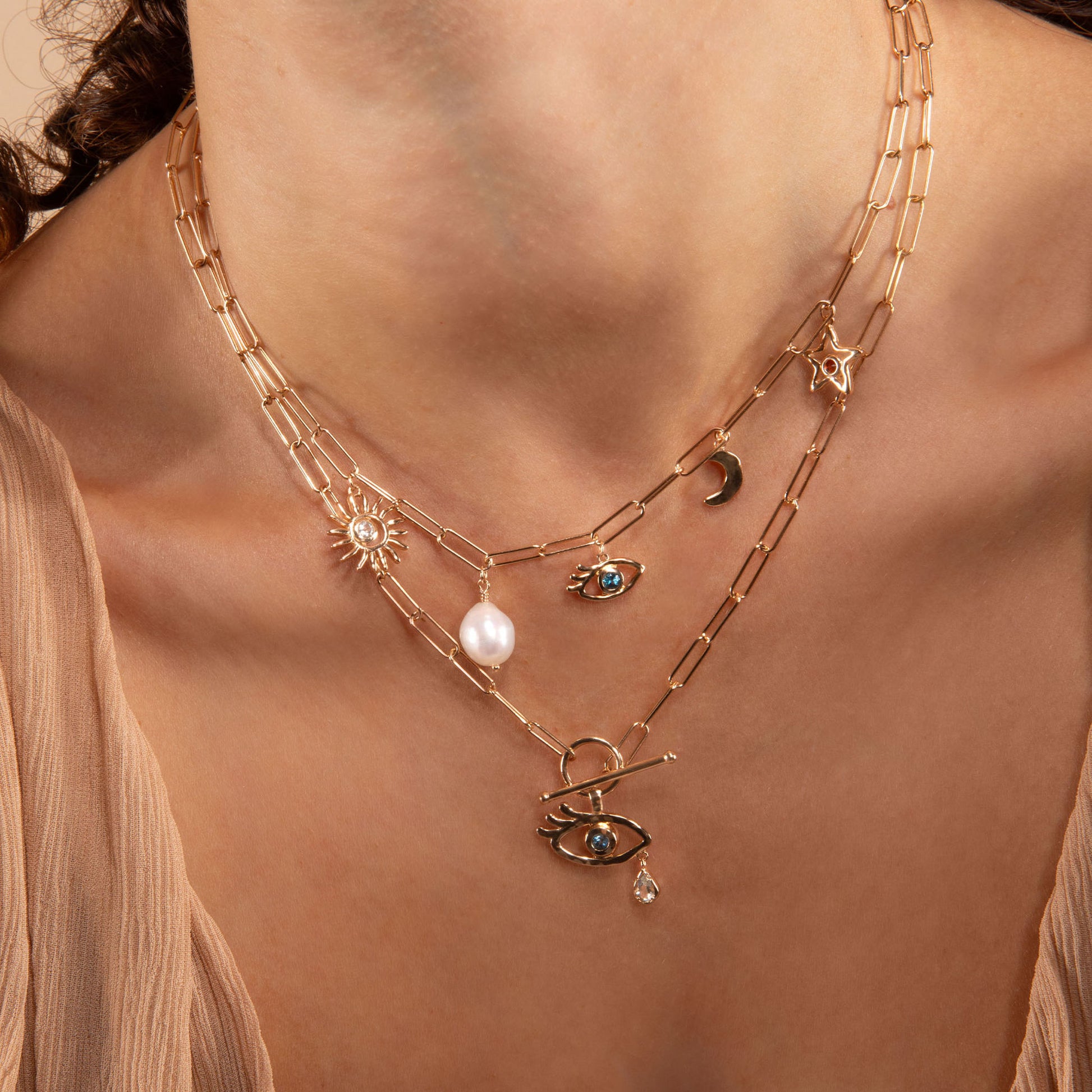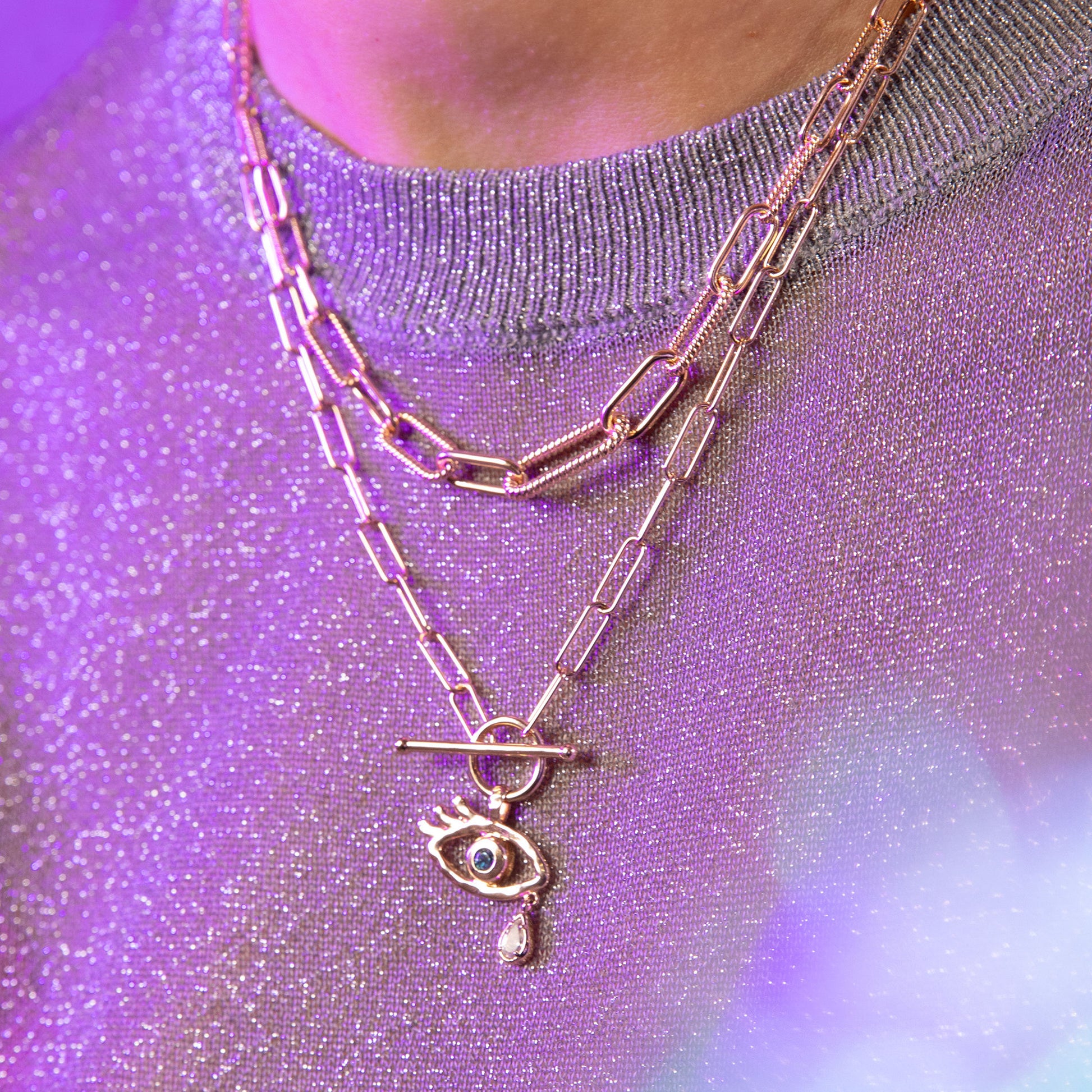 Le collier Tara à larges maillons, se ferme avec un fermoir original en T. Il est orné d'un œil protecteur serti d'une améthyste verte et d'une topaze bleue, ce collier gri-gri ne vous quittera plus.
