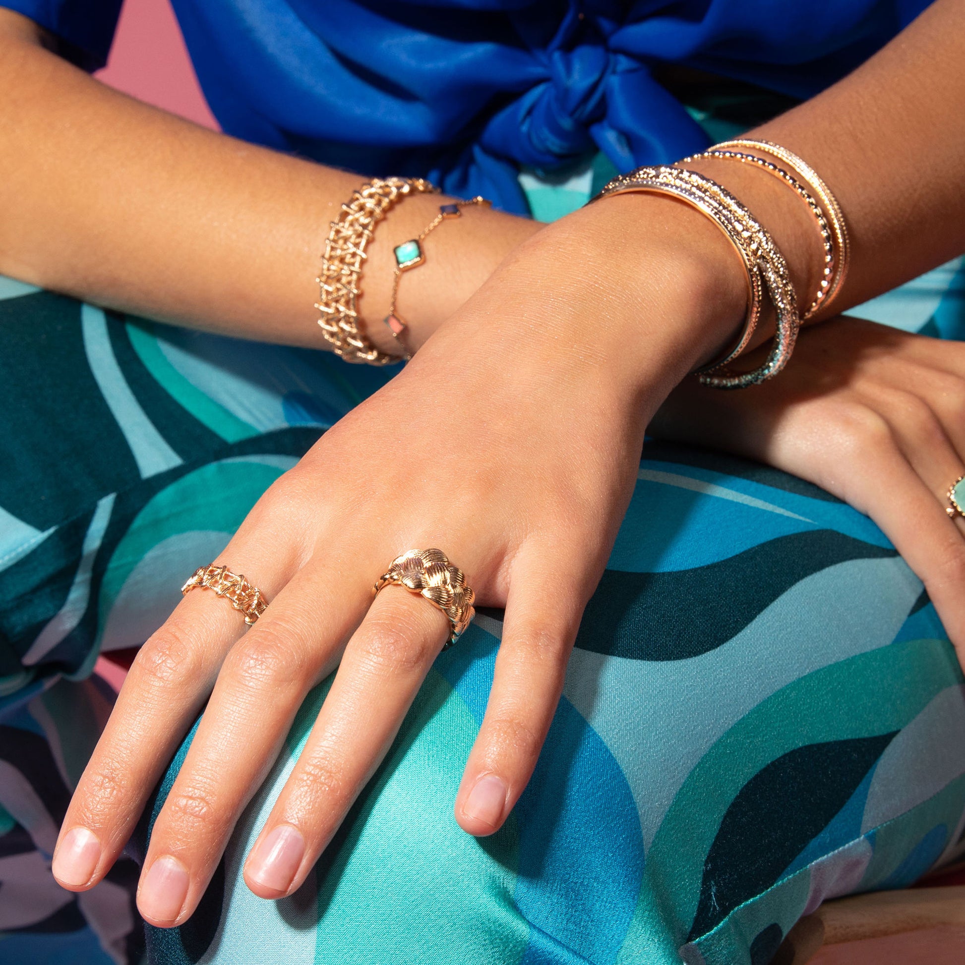 Inspirée des feuilles de palmiers tréssées, la bague Maeva, aux jolis détails ciselés, capte la lumière pour mieux la diffuser. De quoi briller de mille feux !