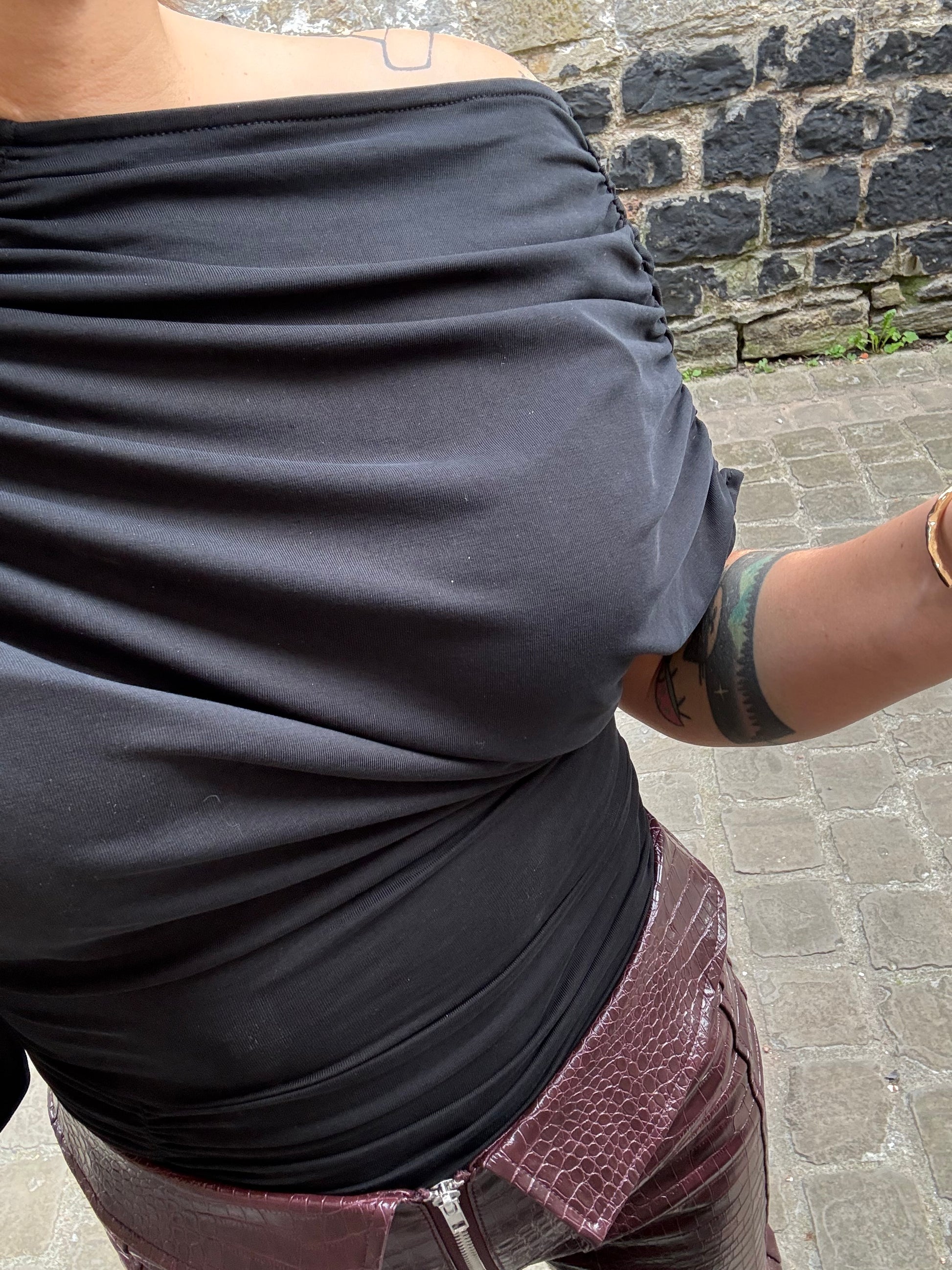 Haut drapé asymétrique. Coupe ajustée. Encolure drapée d'un côté et manche de l'autre, de l'épaule au dos. Dos nu. Taille drapée avec côtés drapés.